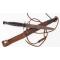 Un premier type de gaine vit le jour, en cuir, inspirée par celle de son modèle, avec toute fois une patelette à pression en haut à la place de la bande élastique; la patte de suspension est plus fine et le ceinturon passe entre les 2 épaisseurs de cuir ; suppression des 4 pattes destinées à être cousues sur la tenue : alourdissement de la bouterolle, pour compenser le poids de la poignée, et adjonction d'un lacet de jambe; le tout réalisé avec le concours de M.Charon, fourbisseur à Paris. Avec les années, une petite patte en métal embouti fut ajouté au fourreau afin d'en faire un poignard de botte. De même, pour démarcher les contrats militaires éventuels, un étui en métal fut crée, plus solide et plus rigide, doté intérieurement de battes pour maintenir l'arme. Ce modèle est prévu avec un passant de ceinture et une patte à pression en forte toile.