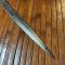 Lame en acier de 38 cm  à double tranchant, elle est gravée en relief sur plus des deux tiers de voluptes, feuilles, entrelac, fleurs de Lys stylisée etc....