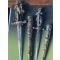 dague a decor d;homme en armure pour la poignee et fourreau a décor de heaume et tete grotesque ; longueur 275mm ;lame 135mm bon état des 2 dagues
