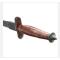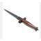 Lame à double-tranchant en acier bronzé de 18 cm avec repose pousse. Pommeau avec casse-tête en acier. Poignée gainée de rondelles de cuir compressées. Fourreau cuir avec renfort métal.
