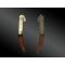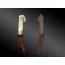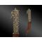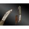 Lame courbe à un tranchant, gravée d’un oiseau sur un côté. Poignée en métal recouvert d’argent à motifs géométriques et clous d’argent d’un côté et lisse de l’autre.