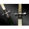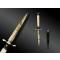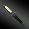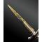 Lame à double tranchant et arête médiane, gravée à l’acide d’un chevalier et de rinceaux sur fond d’or.