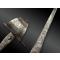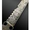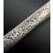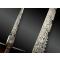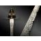 Lame en acier à simple tranchant, dos guilloché, contre-tranchant, terminée en pointe et ornée au deux-tiers d’un décor gravé à l’acide, organisé en rinceaux feuillagés et animé de figures aviaires. Talon de lame de section rectangulaire avec repose-pouce et ajours circulaires.