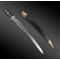 Lame en acier à un tranchant et un contre tranchant, à gorges ; ciselée de faisceaux d’armes, soleils, fleurs, nuages, d’un croissant de lune, chasseur et gravée d’initiales sur les deux pans.