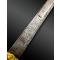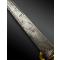Lame en acier à un tranchant et un contre tranchant, à gorges ; ciselée de motifs géométriques, de rinceaux, de cerfs, de couronnes et d’étoiles sur les deux pans et le dos.