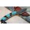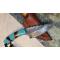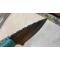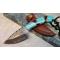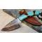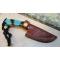 Longueur totale 18.42cm. Longueur de lame 7.62cm. Lame en acier damas de type drop point. Lame acier damas 256 couches. Construction d'une seule pièce - Full tang - Plaquettes du manche en turquoise synthétique. Trou dans le manche avec dragonne. Etui en cuir marron.