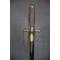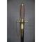 Fusée recouverte d'un filigrane de cuivre. Garde en laiton à deux quillons droits se terminant par une tête de chien.