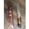 Magnifique dague Damas tranchant rapporte manche en bois pétrifié du désert de l'Arizona longueur de lame 18 cm longueur totale 32cm étui cuir intérieur bois de peuplier parfait état