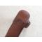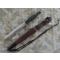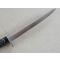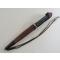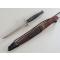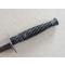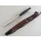 Dague française "Le Commando" crée en 1953 par Louis Henrion un ancien instructeur corps à corps du 11ème Choc et André Conversat un coutelier de Nogent en Bassigny. Cette dague sera vendue dans les foyers de régiment, chez les Maitres Tailleurs et dans des coutelleries et armureries durant une période allant de 1953 jusqu’au début des années 80. Elle sera aussi accessible en achat par correspondance, même à partir de l’Outre Mer. La Marine Nationale en passera plusieurs commandes pour les Commandos Marine dès 1957 et l’Armée de Terre fera de même pour ses unités stationnées Outre Mer (parachutistes de l’Infanterie de Marine). Ces dagues étaient proposées par le fabricant avec 4 types de finition, inox poli, inox brossé (mate), inox sablé (gris), acier bronzé. Cet exemplaire est une version en inox poli brillant et c’est une version stérile, sans marquage sur la garde. Christian Mery y fait référence dans son livre sur les poignards français dans le chapitre consacré à ces dagues. Elle est en bon état d’usage et les photos participent à sa description. Lame d’une longueur de 157mm, largeur et profil d’origine. Pas de dent, pas de choc, pas de trace d’affutage hormis sur la pointe, aucune oxydation. La poignée possède encore 60% de sa peinture d’origine. Pas de jeu dans la poignée. Le fourreau cuir est un modèle du 3ème type, c’est la dernière version. Il se différencie des autres versions par la sangle de poignée qui est fixée par un rivet et donc ne coulisse pas, la gaine qui est légèrement plus longue afin de pouvoir accueillir d’autres dagues françaises de la même période tel que la SAS Véritable et cette version de fourreau n’a jamais de marquage au dos.