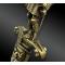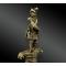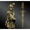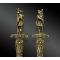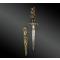 Poignée en laiton doré, présentant un chevalier armé en ronde-bosse. Vêtu d’une côte de maille, d’un armet empanaché. Les épaulières léonines rejoignent le plastron et le dosseret qui sont gravés. La main droite est couverte par le gantelet et elle enserre la poignée de son épée. La main gauche, à nue, tient le fourreau. Une dague est située à la ceinture. Les genouillères et jambières sont gravées en suite. Aux pieds est posé le second gantelet. Garde à quillons inversés ; croisière à écu couronné.