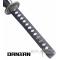 Danzan katana dragon lame en resine noir avec gorge. Concus pour les combats et les chocs. Lame ultra robuste. Tsuka-poignee : Bois dur, imitation peau de raie et coton noir Tsuba-garde: Acier bronze, forme ronde avec dragon Habaki : Emblème Danzan en acier Saya-fourreau : Bois robuste avec un dragon en decoration Longueur avec fourreau : 103cm Longueur katana : 99cm Longueur lame : 71cm Poids katana et fourreau : 770grs Poids katana seul : 500grs Accessoire inclus : -Housse de protection -Support bois Danzan Concus pour les entrainements au maniement du sabre sans chocs.