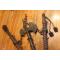Beau ratelier avec répliques d' armes de combat médiévales en métal , Masse d 'arme, hache et fléau; manche en bois dont deux manches tournés, Sur support en fer forgé avec suspente murale par chaine. Style Moyen-Age donjon chateau armure héroïque fantaisie