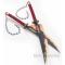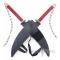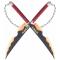 Ensemble des 2 sabres en acier de Tengen Uzui, le pilier du Son. Lame en acier 440 peint. Manche en bois tresse de coton avec chaine en acier a son extremite. Garde en acier decoree. Longueur de chaque epee : 78cm Longueur de chaque lame : 47cm Poids de chaque epee : 1025grs Livre avec son support dorsal en simili cuir noir.