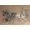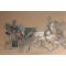 Dessin original au crayon réhaussé en couleurs représentant un attelage à deux chevaux tirant une calèche, conduit par un cochet et transportant un officier militaire en uniforme Signé J. Jeanneret et daté 1845 dimensions du dessin : 24 x 18 cm encadré sous verre état voir photos