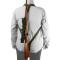 Bretelle réglable double en cordura naturelle pour porter l’arme comme un sac à dos pour avoir plus de liberté du mouvement, entièrement bordée avec un liseré vert, partie postérieure en gomme antidérapante pour avoir une parfaite adhérence à l’épaule, attaches réglables en cuir nabuk et boucles en métal cuivré. Broderie: “Riserva”