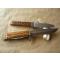 La marque Leegebruch a existé de 1946 à 1991, dans la ville est-allemande du même nom, elle a produit de la coutellerie, principalement pour l'exportation, sous marque GML ( Genossenschaft der Messerschmiede Leegebruch ) ; ses couteaux, fabriqués selon des méthodes traditionnelles, semi-artisanales, avaient une excellente réputation, tant au niveau solidité qu'au niveau qualité des aciers inox utilisés ; ce modèle de couteaux jumeaux est rare, il est dans un état exceptionnel et il fera le bonheur d'un chasseur ou d'un amateur de belles pièces de coutellerie traditionnelle de haute qualité.