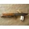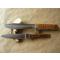 Très bel ensemble de chasse, production des années 1970-80, grand couteau à la lame idéale pour servir un grand gibier ou pour trancher saucisson ou jambon ... Poignée des deux objets en bakélite imitation bois de cerf, sans aucun éclat ou fissure, robustes lames en acier inoxydable 440C au tranchant rasoir, construction en plate semelle garantissant la solidité ; garde en laiton à 1 quillon ; le grand possède une scie de 8 cm à double rangée de dents + une lame à éviscérer de 8 cm.