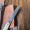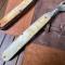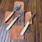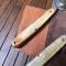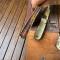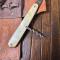 Ensemble de couverts pliant français antique en celluloïd pyralin d'acwalite type nacre, dans un étui en cuir en bon état mise à part la cuillère qui a le manche oxydé et un petit accident sur une plaquette.
