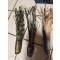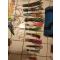 Lot de  12 leurres de traîne dont 8 armés. 4 leurres de 40 cm de long. 1 de 33cm. 1 de 30 cm. 1 de 29 cm. 2 de 25 cm. 1 de 22 cm. 2 de 18 cm.