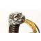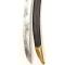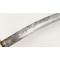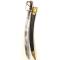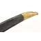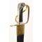 Etonnant large sabre d'officier de marine, montage révolutionnaire de plusieurs matériaux. Garde à deux branches en laiton cuivreux doré, bordure décorée, la branche secondaire en forme de S, quillon plat en forme de palmette, fusée d'ébène cannelée et filigranée de cuivre rouge, virole basale et calotte à longue queue et pommeau tête de lion en argent. Large lame courbe à pans creux gravée à l'acide de motifs orientaux, forte traces d'oxydation, longueur réglementaire 67.5cm pour les lame de marine, largeur au talon 5cm. Fourreau bois recouvert de cuir noirci cousu à l'envers sur le dos, ancienne réparation en partie basse, chape à bouton de suspente et bouterolle de laiton. Longueur totale 82cm