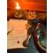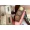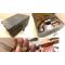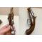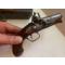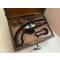 Reproduction de coffret gainé de cuir clouté avec supports en bois vernis contenant une mini poire à poudre ancienne, 2 flacons avec bouchon en bois. Particularité sur le support qui contient la poire, il y a aussi un réceptacle avec quelques balles de calibre 9mm à l'intérieur. L'arme est fonctionnelle. Batterie cémentée par un armurier. Mécanique est bonne, le chien tient les 2 crans et le ressort est ferme