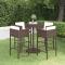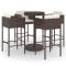 Ensemble bar de jardin 5 pcs et coussins Résine tressée MarronCet ensemble élégant de bar de jardin vous permet de passer des moments agréables et confortables avec votre famille et vos amis. Fabriqué en rotin PE résistant aux intempéries et à l'eau, cet ensemble de bar d'extérieur est facile à nettoyer, résistant et adapté à un usage quotidien. Le cadre en acier revêtu de poudre rend la table et les tabourets robustes et durables. Le plateau rond est idéal pour poser des boissons, de la nourriture ou des objets décoratifs. Le repose-pieds et les coussins ajoutent un confort d'assise supplémentaire au tabouret. Grâce à la construction légère, tous les éléments sont faciles à déplacer. Remarque : afin de prolonger la durée de vie des meubles d'extérieur, nous vous recommandons de les protéger avec une housse imperméable. Maximum 110 kg par siège. Soyez conscient du risque de feu ouvert et d'autres sources de forte chaleur à proximité de l'appareil.