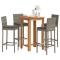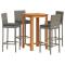 Ensemble de bar de jardin 5 pcs gris bois massif acacia rotinCet ensemble de bar de jardin, au design élégant et contemporain, sera un excellent choix pour manger ou vous détendre dans le jardin. Matériau durable : la résine tressée, également connue sous le nom de poly rotin, est un matériau synthétique solide et nécessitant peu d'entretien qui ressemble au rotin naturel. Elle est légère, facile à nettoyer et couramment utilisée pour les produits d'extérieur en raison de sa durabilité et de ses propriétés de résistance aux intempéries. Fabriqués en résine tressée légère, ces tabourets de bar sont robustes et faciles à déplacer. Plateau de table robuste : le bois d'acacia massif est un beau matériau naturel. Le bois d'acacia est un bois dur tropical, dense, robuste et durable. Fabriquée en bois d'acacia massif, cette table de bar est robuste et stable. Vous pouvez y placer collations, boissons et toutes vos décorations préférées. Expérience d'assise confortable : les coussins d'assise bien rembourrés et les repose-pieds intégrés ajoutent un confort d'assise supplémentaire pour le tabouret. Housse amovible et lavable : ces coussins de siège sont dotés de housses amovibles pour un lavage et un entretien faciles. Bon à savoir :Pour que vos meubles d'extérieur restent beaux, nous vous recommandons de les protéger avec une housse imperméable. Maximum 110 kg par siège. Soyez conscient du risque de feu ouvert et d'autres sources de forte chaleur à proximité de l'appareil.