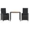 Ensemble de bistro 3 pcs avec coussins noir résine tresséeSavourez une tasse de café ou discutez avec votre famille et vos amis dans le jardin, l'arrière-cour ou sur le balcon avec cet ensemble de bistro confortable ! Matériau durable : la résine tressée, également connue sous le nom de poly rotin, est un matériau synthétique solide et nécessitant peu d'entretien qui ressemble au rotin naturel. Il est léger, facile à nettoyer et couramment utilisé pour les meubles d'extérieur en raison de sa durabilité et de ses propriétés de résistance aux intempéries. Dossier et repose-pied réglables : ce siège de jardin est doté d'une poignée. Vous pouvez régler le dossier et le repose-pied dans n'importe quelle position en tirant sur la poignée, et les remettre rapidement dans leur position initiale. Expérience d'assise confortable : ce mobilier d'extérieur, doté de coussins épais, offre une expérience d'assise confortable. Housse amovible et lavable : ces coussins de siège sont dotés de housses amovibles pour un lavage et un entretien faciles. Les coussins de dossier ont un rabat à l'arrière pour une fixation facile aux dossiers. Dessus stable et facile à nettoyer : cette table de jardin a un dessus en bois d'acacia robuste, durable et facile à nettoyer avec un chiffon humide. Bon à savoir : Pour que vos meubles d'extérieur restent beaux, nous vous recommandons de les protéger avec une housse imperméable. Maximum 110 kg par siège. Soyez conscient du risque de feu ouvert et d'autres sources de forte chaleur à proximité de l'appareil.