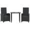 Ensemble de bistro 3 pcs avec coussins noir résine tresséeSavourez une tasse de café ou discutez avec votre famille et vos amis dans le jardin, l'arrière-cour ou sur le balcon avec cet ensemble de bistro confortable ! Matériau durable : la résine tressée, également connue sous le nom de poly rotin, est un matériau synthétique solide et nécessitant peu d'entretien qui ressemble au rotin naturel. Il est léger, facile à nettoyer et couramment utilisé pour les meubles d'extérieur en raison de sa durabilité et de ses propriétés de résistance aux intempéries. Dossier et repose-pied réglables : ce siège de jardin est doté d'une poignée. Vous pouvez régler le dossier et le repose-pied dans n'importe quelle position en tirant sur la poignée, et les remettre rapidement dans leur position initiale. Expérience d'assise confortable : ce mobilier d'extérieur, doté de coussins épais, offre une expérience d'assise confortable. Housse amovible et lavable : ces coussins de siège sont dotés de housses amovibles pour un lavage et un entretien faciles. Les coussins de dossier ont un rabat à l'arrière pour une fixation facile aux dossiers. Dessus en verre : le dessus de la table d'extérieur est fabriqué en verre trempé solide et durable, ce qui le rend facile à nettoyer avec un chiffon humide et ajoute une touche d'élégance à votre espace extérieur. Bon à savoir : Pour que vos meubles d'extérieur restent beaux, nous vous recommandons de les protéger avec une housse imperméable. Maximum 110 kg par siège. Soyez conscient du risque de feux ouverts et d'autres sources de forte chaleur à proximité du produit.
