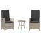 Ensemble de bistro 3 pcs et coussins gris clair résine tresséeSavourez un café ou discutez avec votre famille et vos amis dans le jardin, l'arrière-cour ou sur le balcon avec cet ensemble de bistro confortable ! Matériau durable : la résine tressée, également connue sous le nom de poly rotin, est un matériau synthétique solide et nécessitant peu d'entretien qui ressemble au rotin naturel. Il est léger, facile à nettoyer et couramment utilisé pour les meubles d'extérieur en raison de sa durabilité et de ses propriétés de résistance aux intempéries. Dossier réglable : ce meuble de jardin est équipé d'une poignée sur le côté droit. Vous pouvez régler le dossier dans n'importe quelle position en tirant sur la poignée. Vous pouvez également remettre rapidement le dossier dans sa position initiale à l'aide de la poignée. Expérience d'assise confortable : cet ensemble de meubles d'extérieur, doté de coussins épais, offre une expérience d'assise confortable. Housse amovible et lavable : ces coussins de siège sont dotés de housses amovibles pour un lavage et un entretien faciles. Cadre robuste et stable : le cadre en acier enduit de poudre assure la solidité et la stabilité du meuble de jardin pour une utilisation quotidienne à l'extérieur. Bon à savoir : Pour que vos meubles d'extérieur restent beaux, nous vous recommandons de les protéger avec une housse imperméable. Maximum 110 kg par siège. Soyez conscient du risque de feux ouverts et d'autres sources de forte chaleur à proximité du produit.