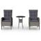 Ensemble de bistro de jardin 3 pcs Résine tressée GrisCet élégant ensemble de bistro de jardin en résine tressée est conçu pour être le point de mire de votre jardin ou de votre patio. C'est un excellent choix pour les repas en plein air ou pour vous détendre dans l'espace extérieur ! Matériau de qualité supérieure : cadre en acier robuste enveloppé de résine tressée tissée à la main résistante aux intempéries, cet ensemble de patio d'extérieur est résistant à la rouille et à la moisissure, ce qui peut fournir des années de détente de qualité. Structure stable et solide : les cadres en acier garantissent la solidité et la stabilité. Chaises confortables : conçue avec un dossier et des accoudoirs incurvés, la chaise inclinable de jardin a une forme plus ergonomique pour un confort maximal. Des coussins sont inclus pour un soutien supplémentaire et la housse avec fermeture éclair est amovible pour un lavage facile. Mécanisme de levage à gaz : grâce au mécanisme de levage à gaz, le dossier du fauteuil de jardin est réglable pour s'adapter à vos positions. En touchant le bouton sur le côté, le dossier peut s'incliner, pour une position confortable. Construction légère : grâce à la construction légère, la table de bistrot et les chaises en résine tressée sont faciles à déplacer. Remarque : Afin de prolonger la durée de vie de votre mobilier d'extérieur, nous vous recommandons de le protéger avec une housse imperméable. Maximum 110 kg par siège. Soyez conscient du risque de feu ouvert et d'autres sources de forte chaleur à proximité de l'appareil.
