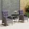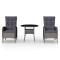 Ensemble de bistro de jardin 3 pcs Résine tressée GrisCet élégant ensemble de bistro de jardin en résine tressée est conçu pour être le point de mire de votre jardin ou de votre patio. C'est un excellent choix pour les repas en plein air ou pour vous détendre dans l'espace extérieur ! Matériau de qualité supérieure : cadre en acier robuste enveloppé de résine tressée tissée à la main résistante aux intempéries, cet ensemble de patio d'extérieur est résistant à la rouille et à la moisissure, ce qui peut fournir des années de détente de qualité. Structure stable et solide : les cadres en acier garantissent la solidité et la stabilité. Chaises confortables : conçue avec un dossier et des accoudoirs incurvés, la chaise inclinable de jardin a une forme plus ergonomique pour un confort maximal. Des coussins sont inclus pour un soutien supplémentaire et la housse avec fermeture éclair est amovible pour un lavage facile. Mécanisme de levage à gaz : grâce au mécanisme de levage à gaz, le dossier du fauteuil de jardin est réglable pour s'adapter à vos positions. En touchant le bouton sur le côté, le dossier peut s'incliner, pour une position confortable. Construction légère : grâce à la construction légère, la table de bistrot et les chaises en résine tressée sont faciles à déplacer. Remarque : Afin de prolonger la durée de vie de votre mobilier d'extérieur, nous vous recommandons de le protéger avec une housse imperméable. Maximum 110 kg par siège. Soyez conscient du risque de feu ouvert et d'autres sources de forte chaleur à proximité de l'appareil.