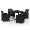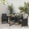 Ensemble à dîner de jardin avec coussins 5 pcs poly rotin noirCet ensemble élégant de salle à manger de jardin vous permet de passer des moments agréables et confortables avec votre famille et vos amis. Fabriqué en résine tressée résistante aux intempéries et imperméable, cet ensemble de salle à manger d'extérieur est facile à nettoyer, résistant à l'usure et adapté à une utilisation quotidienne. Le cadre en acier enduit de poudre rend la table et les chaises robustes et durables. Le dessus de table en verre est idéal pour placer des boissons, de la nourriture ou des objets décoratifs. Les coussins d'assise et de dossier épais et souples, remplis de mousse, ajoutent également au confort d'assise. De plus, vous pouvez tirer le dossier vers le bas et ranger les chaises sous la table, économisant ainsi un espace de rangement précieux lorsque l'ensemble n'est pas utilisé. Grâce à la construction légère, tous les articles sont faciles à déplacer. Remarque : afin de prolonger la durée de vie des meubles d'extérieur, nous vous recommandons de les protéger avec une housse imperméable. Maximum 110 kg par siège. Soyez conscient du risque de feu ouvert et d'autres sources de forte chaleur à proximité de l'appareil.