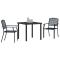 Ensemble de jardin 3 pièces en acier anthraciteCet ensemble de salle à manger de jardin 3 pièces est parfait pour une ambiance cosy en extérieur, offrant de l'espace pour deux adultes pour profiter de leurs repas ou de se détendre. Le cadre en acier noir avec revêtement en poudre et son design moderne font de lui un super ajout à ton balcon ou patio, alliant praticité et style dans n'importe quel coin extérieur. Choix stylé : Le design moderne en acier noir fait que l'ensemble s'harmonise avec n'importe quel jardin tout en se démarquant. Construction robuste : Fabriqué en métal solide, cet ensemble est fait pour résister à de nombreuses saisons en extérieur. Assise confortable : Les accoudoirs joliment courbés et l'espace assis spacieux le rendent agréable pour les repas ou les moments chill avec des amis. Entretien facile : La finition en poudre prévient la rouille et rend le nettoyage super simple, vraiment pratique pour un usage quotidien. Taille compacte : Le design 2 places est parfait pour les petits espaces, ça fait un excellent choix pour les balcons ou patios sans sacrifier le style. Maximum 110 kg par siège.