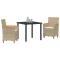 Ensemble de jardin de 3 pièces avec coussins en poly rotin beigeCet ensemble de chaises de jardin est élégant et ajoute une touche de style et de confort à ton extérieur. Fait en rattan PE solide et en bois d'acacia massif avec une finition huilée, il est agréable à l'oeil et offre un bon confort, que ce soit pour se détendre ou recevoir, transformant ton patio ou balcon. Matériau Durable : Fait en rattan PE de haute qualité, connu pour sa robustesse et sa résistance aux intempéries, ces chaises sont faites pour l'extérieur et ont vraiment du style. Ce matériau imite le rattan naturel, offrant une durabilité parfaite pour ton jardin ou patio. Siège Confortable : Chaque chaise a des coussins épais et confortables, recouverts d'un tissu amovible et lavable, rendant ton expérience super agréable. Les coussins offrent un bon soutien, parfaits pour profiter d'un bon moment en extérieur avec tes proches. Cadre Stable : Ces chaises ont un cadre en acier revêtu de poudre pour un soutien solide. Elles supportent jusqu'à 110 kg, donc tout le monde peut s'y asseoir. Entretien Facile : Avec des housses de coussin amovibles, le nettoyage est hyper simple, gardant tes sièges extérieurs impeccables. Un entretien facile pour que tu puisses profiter de ton mobilier sans souci. Utilisation Polyvalente : Le design chic et les fonctionnalités pratiques font de ces chaises un choix parfait pour toutes sortes d'occasions, que ce soit pour un dîner, bronzer ou pour une réunion conviviale. Elles s'intègrent dans tous les espaces extérieurs, offrant à la fois fonctionnalité et style. Maximum 110 kg par siège. Soyez conscient du risque de feux ouverts et d'autres sources de forte chaleur à proximité du produit.