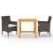 Ensemble à manger de jardin 3 pcs MarronCréez une esthétique convaincante et uniforme dans votre espace extérieur avec cet ensemble de salle à manger de jardin ! La table de salle à manger est en bois d'acacia massif avec une finition à l'huile, ce qui la rend stable, durable et facile à entretenir. Dotées d'un cadre en acier enduit de poudre recouvert de résine tressée résistante aux intempéries, ces chaises sont robustes et faciles à nettoyer. Conçue avec un dossier et un accoudoir incurvés, la chaise à dîner a une forme plus ergonomique pour un confort maximal. Chaque siège est doté d'un coussin rembourré amovible pour ajouter du confort pendant votre temps de détente. Remarque importante : Nous vous recommandons de couvrir l'ensemble de salle à manger pendant la pluie, la neige et le gel pour une utilisation durable. Maximum 110 kg par siège. Soyez conscient du risque de feu ouvert et d'autres sources de forte chaleur à proximité de l'appareil.