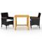 Ensemble à manger de jardin 3 pcs NoirCréez une esthétique convaincante et uniforme dans votre espace extérieur avec cet ensemble de salle à manger de jardin ! La table de salle à manger est en bois d'acacia massif avec une finition à l'huile, ce qui la rend stable, durable et facile à entretenir. Dotées d'un cadre en acier enduit de poudre recouvert de résine tressée résistante aux intempéries, ces chaises sont robustes et faciles à nettoyer. La chaise d'extérieur, conçue avec dossier incurvé et accoudoir, présente une forme plus ergonomique pour un confort maximal. Les accoudoirs sont joliment décorés de bois d'acacia massif avec une finition à l'huile naturelle, ce qui apporte une sensation de charme rustique. De plus, les coussins bien rembourrés offrent un confort suprême pendant votre temps assis. Remarque importante : Nous vous recommandons de couvrir l'ensemble de salle à manger pendant la pluie, la neige et le gel pour une utilisation durable. Maximum 110 kg par siège. Soyez conscient du risque de feu ouvert et d'autres sources de forte chaleur à proximité de l'appareil.