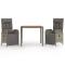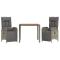 Ensemble à manger de jardin 3 pcs coussins gris résine tresséeCet ensemble de salle à manger de jardin tendance, au design élégant et contemporain, est un excellent choix pour manger ou vous détendre dans votre jardin. Matériau résistant aux intempéries : la résine tressée, également connue sous le nom de rotin poly, résiste aux intempéries et est facile à nettoyer. Elle reste belle à l'extérieur pendant une longue période. Elle offre une excellente qualité, commodité et un aspect esthétique.Cadre robuste : les cadres en acier enduit de poudre rendent l'ensemble de salle à manger d'extérieur robuste et stable pour une utilisation quotidienne à l'extérieur.Dessus de table pratique : le dessus de table en bois d'acacia massif est parfait pour placer des boissons, des aliments et des décorations. Il a une belle apparence et est facile à nettoyer.Fonction d'inclinaison : les chaises de jardin sont spécialement conçues avec une fonction d'inclinaison afin que vous puissiez régler le dossier selon votre confort.Expérience d'assise confortable : le dossier ajoute un confort d'assise supplémentaire à la chaise de jardin. De plus, les coussins bien rembourrés vous permettent de vous asseoir confortablement. Bon à savoir :Pour faciliter au maximum le montage, chaque produit est livré avec des instructions. Remarque :Pour que vos meubles d'extérieur restent beaux, nous vous recommandons de les protéger avec une housse imperméable. Maximum 110 kg par siège.