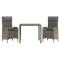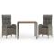 Ensemble à manger de jardin 3 pcs coussins gris résine tresséeCet ensemble de salle à manger de jardin tendance, au design élégant et contemporain, est un excellent choix pour manger ou vous détendre dans votre jardin. Matériau résistant aux intempéries : la résine tressée, également connue sous le nom de rotin poly, résiste aux intempéries et est facile à nettoyer. Elle reste belle à l'extérieur pendant une longue période. Elle offre une excellente qualité, commodité et un aspect esthétique. Cadre robuste : les cadres en acier enduit de poudre rendent l'ensemble de salle à manger d'extérieur robuste et stable pour une utilisation quotidienne à l'extérieur. Dessus de table pratique : le dessus de table en bois d'acacia massif est parfait pour placer des boissons, des aliments et des décorations. Il a une belle apparence et est facile à nettoyer. Fonction d'inclinaison : les chaises de jardin sont spécialement conçues avec une fonction d'inclinaison afin que vous puissiez régler le dossier selon votre confort. Expérience d'assise confortable : le dossier ajoute un confort d'assise supplémentaire à la chaise de jardin. De plus, les coussins bien rembourrés vous permettent de vous asseoir confortablement. Bon à savoir : Pour faciliter au maximum le montage, chaque produit est livré avec des instructions. Remarque : Pour que vos meubles d'extérieur restent beaux, nous vous recommandons de les protéger avec une housse imperméable. Maximum 110 kg par siège. Soyez conscient du risque de feu ouvert et d'autres sources de forte chaleur à proximité de l'appareil.