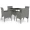 Ensemble à manger de jardin 5 pcs Gris Résine tressée et verreProfitez des réunions en toute simplicité avec notre salon de jardin de 5 pièces ! Cet ensemble de salle à manger peut sans effort répondre aux besoins de vos invités tout en créant un cadre de restauration en plein air parfait ! Fabriqué en résine tressée protégée contre les rayons UV avec une structure en acier robuste recouvert de poudre, cet ensemble de salle à manger est résistant aux intempéries et robuste. Le dessus de table en verre trempé renforcé crée une surface lisse et facile à nettoyer. Chaque siège est doté d'un coussin amovible épaississement rembourré pour plus de confort pendant votre temps de détente. Toutes les housses de coussin sont amovibles avec un design à fermeture éclair. De plus, la construction légère facilite le déplacement, le réarrangement et le transport de chaque pièce. Remarque : nous vous recommandons de couvrir l'ensemble pendant la pluie, la neige et le gel. Maximum 110 kg par siège. Soyez conscient du risque de feu ouvert et d'autres sources de forte chaleur à proximité de l'appareil.
