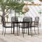 Ensemble à manger de jardin 5 pcs NoirCet ensemble de meubles de salle à manger tendance au design élégant et aux lignes épurées est un excellent choix pour votre jardin, patio, terrasse, cuisine et même salle à manger. L'élégance simpliste de cet ensemble de salle à manger rend votre dîner quotidien spécial. Cet ensemble de salle à manger de jardin dispose d'un cadre en acier enduit de poudre qui rend la table et les chaises stables et durables. Le dossier et le siège sont fabriqués en corde de coton torsadée, qui est douce au toucher et robuste pour une utilisation à long terme. De plus, la table est dotée d'un dessus en verre trempé, facile à nettoyer avec un chiffon humide et parfait pour placer des repas, des boissons et d'autres objets décoratifs. Remarque : afin de prolonger la durée de vie des meubles d'extérieur, nous vous recommandons de les protéger avec une housse imperméable. Maximum 110 kg par siège.