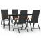 Ensemble à manger de jardin 5 pcs Noir et marron Résine tresséeCréez une esthétique convaincante et uniforme dans votre espace extérieur avec cet ensemble de salle à manger de jardin ! Matériau résistant aux intempéries : la résine tressée, également connue sous le nom de rotin poly, résiste aux intempéries et est facile à nettoyer. Elle reste belle à l'extérieur pendant une longue période. Elle offre une excellente qualité, commodité et un aspect esthétique. Cadre robuste : les cadres en acier enduit de poudre rendent l'ensemble de salle à manger d'extérieur robuste et stable pour une utilisation quotidienne à l'extérieur. Dessus de table pratique : le dessus lisse de la table de salle à manger est en verre trempé, facile à nettoyer avec un chiffon humide. De plus, le dessus robuste est parfait pour placer des repas, des boissons et d'autres objets décoratifs. Design inclinable et pliable : les dossiers des chaises disposent de 7 réglages d'inclinaison, de sorte que vous puissiez toujours trouver la position assise la plus confortable. De plus, les chaises de jardin peuvent être pliées pour économiser de l'espace lorsqu'elles ne sont pas utilisées. Remarque : Afin de prolonger la durée de vie de votre mobilier d'extérieur, nous vous recommandons de le protéger avec une housse imperméable. Chaque produit est livré avec un manuel de montage dans la boîte pour un montage facile. Maximum 110 kg par siège.