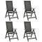 Ensemble à manger de jardin 5 pcs aluminium anthraciteCet ensemble de salle à manger de jardin à la fois pratique et élégant est parfait pour vous détendre ou dîner dans votre jardin ou sur votre terrasse. Le cadre en aluminium enduit de poudre rend l'ensemble de meubles très robuste et durable. Les chaises de jardin sont dotées de sièges et de dossiers en textilène doux au toucher, réglables sur 7 positions, afin que vous puissiez toujours trouver la position assise la plus confortable. Les fauteuils peuvent être pliés pour gagner de la place lorsqu'ils ne sont pas utilisés. La table est dotée d'un dessus de table en verre, facile à nettoyer et adapté à une utilisation en plein air. Remarque : afin de prolonger la durée de vie des meubles d'extérieur, nous vous recommandons de les protéger avec une housse imperméable. Maximum 110 kg par siège.