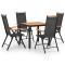Ensemble à manger de jardin 5 pcs aluminium noirCet ensemble de salle à manger de jardin à la fois pratique et élégant est parfait pour vous détendre ou dîner dans votre jardin ou sur votre terrasse. Le cadre en aluminium enduit de poudre rend l'ensemble de meubles très robuste et durable. Les chaises de jardin sont dotées de sièges et de dossiers en textilène doux au toucher, réglables sur 7 positions, afin que vous puissiez toujours trouver la position assise la plus confortable. Les accoudoirs et la barre supérieure ajoutent aux chaises un aspect élégant. Les fauteuils peuvent être pliés pour gagner de la place lorsqu'ils ne sont pas utilisés. La table est dotée d'un dessus de table en WPC, facile à nettoyer et adapté à une utilisation en plein air. Remarque : afin de prolonger la durée de vie des meubles d'extérieur, nous vous recommandons de les protéger avec une housse imperméable. Maximum 110 kg par siège.