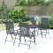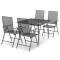 Ensemble à manger de jardin 5 pcs anthracite acierCet ensemble de salle à manger de jardin tendance, au design élégant et contemporain, est un choix parfait pour vous détendre dans votre jardin. Matériau robuste : l'acier est un matériau exceptionnellement dur et solide. Il offre robustesse et stabilité. Le revêtement par poudre et le revêtement électronique de l'acier créent une couche protectrice contre l'usure et la corrosion.Cadre stable : le cadre en acier enduit de poudre et e-coated assure la robustesse et la stabilité de l'ensemble de salle à manger.Fonction réglable et pliable : les dossiers des chaises de salle à manger sont réglables en 6 positions selon votre confort. Vous pouvez les replier pour économiser de l'espace lorsqu'ils ne sont pas utilisés.Table pratique : le dessus robuste de la table à manger est parfait pour placer des repas, des boissons et d'autres objets décoratifs.Design en maille : l'ensemble de salle à manger d'extérieur avec un design en maille a un aspect simple et intemporel et convient aux balcons, porches, jardins, terrasses, etc. Remarque :Pour que vos meubles d'extérieur restent beaux, nous vous recommandons de les protéger avec une housse imperméable. Maximum 110 kg par siège.