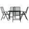 Ensemble à manger de jardin 5 pcs anthracite métal mailleProfitez d'un bon repas ou d'un thé l'après-midi dans votre espace extérieur avec cet ensemble de salle à manger de jardin ! Ayant un design élégant, il deviendra le point central de votre jardin et de votre terrasse ! Cadre robuste : le cadre en métal rend cet ensemble de meubles de jardin robuste et durable, offrant un service à vie.Conception en maille : cet ensemble de salle à manger, avec son design en maille, peut efficacement éviter l'accumulation d'eau, ajoutant une apparence élégante à votre espace de vie extérieur.Dessus de table pratique : le dessus robuste de la table de jardin est parfait pour placer les repas, les boissons et d'autres objets décoratifs.Facile à déplacer : ces chaises à manger de jardin sont pliables pour gagner de la place lorsqu'elles ne sont pas utilisées. Vous pouvez facilement les transporter avec vous lors de vos sorties en plein air.Dossier réglable : ces chaises inclinables ont des dossiers qui s'inclinent dans 7 réglages, de sorte que vous puissiez toujours trouver la position la plus confortable. Bon à savoir :Pour que vos meubles d'extérieur restent beaux, nous vous recommandons de les protéger avec une housse imperméable.