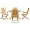 Ensemble à manger de jardin 5 pcs bambouCet ensemble de salle à manger de jardin, au design élégant et contemporain, sera un excellent choix pour manger ou vous détendre dans le jardin. Durable : en tant que matériau naturel, le bambou offre une bonne respirabilité et une faible odeur. Ces qualités rendent l'ensemble à manger de jardin durable, résistant à l'eau et de longue durée.Design pliable : la table et les chaises de salle à manger d'extérieur peuvent être facilement repliées lorsqu'elles ne sont pas utilisées pour faciliter le rangement et le transport.Dessus stable : le dessus stable de la table de jardin est idéal pour placer votre boisson ou toute autre nécessité dont vous avez besoin à portée de main.Une expérience d'assise confortable : dotée d'un dossier, la chaise d'extérieur vous offre un confort optimal. Bon à savoir :Pour que vos meubles d'extérieur restent beaux, nous vous recommandons de les protéger avec une housse imperméable. Maximum 110 kg par siège.