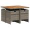 Ensemble à manger de jardin 5 pcs coussins gris résine tresséeCet ensemble de salle à manger de jardin est un excellent choix pour les repas en plein air ou pour vous détendre dans le jardin, dans l'arrière-cour ou sur la terrasse. Matériau durable : la résine tressée, également connue sous le nom de poly rotin, est un matériau synthétique solide et nécessitant peu d'entretien qui ressemble au rotin naturel. Il est léger, facile à nettoyer et couramment utilisé pour les meubles d'extérieur en raison de sa durabilité et de ses propriétés de résistance aux intempéries.Rangement compact : ces chaises sont dotées d'un dossier rabattable, ce qui permet de les ranger facilement sous la table. Une fois pliées, elles se rangent parfaitement sous la table, formant un cube peu encombrant. Expérience d'assise confortable : ce mobilier d'extérieur, doté de coussins épais, offre une expérience d'assise confortable.Housse amovible et lavable : ces coussins de siège sont dotés de housses amovibles pour un lavage et un entretien faciles.Dessus stable et facile à nettoyer : cette table de jardin a un dessus en bois d'acacia robuste, durable et facile à nettoyer avec un chiffon humide. Bon à savoir : Pour que vos meubles d'extérieur restent beaux, nous vous recommandons de les protéger avec une housse imperméable. Maximum 110 kg par siège.