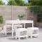 Ensemble à manger de jardin 5pcs blanc bois massif de pinCet ensemble de salle à manger en bois au design simple est un excellent choix pour manger ou vous détendre dans votre espace extérieur ! Bois de pin massif : cet ensemble de salle à manger est fabriqué en bois de pin massif. Le bois de pin solide est un beau matériau naturel. Le bois de pin a un grain droit et les noeuds donnent au matériau son aspect caractéristique et rustique. Dessus robuste : la table à dîner de l'ensemble à dîner d'extérieur est dotée d'un dessus robuste, parfait pour placer vos boissons, aliments et autres objets décoratifs. Design pratique : ces tabourets de jardin en bois n'ont pas de dossier, vous pouvez donc vous asseoir confortablement de chaque côté des tabourets et les ranger sous le comptoir lorsqu'ils ne sont pas utilisés. Nombreuses applications : avec son design minimaliste, l'ensemble à dîner de terrasse peut être intégré dans n'importe quel coin du jardin, terrasse, balcon, jardin, etc. Bon à savoir : Pour que vos meubles d'extérieur restent beaux, nous vous recommandons de les protéger avec une housse imperméable. Maximum 110 kg par siège.
