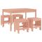 Ensemble à manger de jardin 5pcs bois massif DouglasCet ensemble de salle à manger en bois au design simple est un excellent choix pour manger ou vous détendre dans votre espace extérieur ! Bois de Douglas massif : cet ensemble à dîner est fabriqué en bois de Douglas massif. Le bois de Douglas massif est un bois très durable qui fonctionne bien à l'extérieur. Le bois de Douglas est également assez solide pour l'utiliser avec un minimum de soins, même sous l'influence des intempéries.Dessus robuste : la table à dîner de l'ensemble à dîner d'extérieur est dotée d'un dessus robuste, parfait pour placer vos boissons, aliments et autres objets décoratifs.Design pratique : ces tabourets de jardin en bois n'ont pas de dossier, vous pouvez donc vous asseoir confortablement de chaque côté des tabourets et les ranger sous le comptoir lorsqu'ils ne sont pas utilisés.Nombreuses applications : avec son design minimaliste, l'ensemble à dîner de terrasse peut être intégré dans n'importe quel coin du jardin, terrasse, balcon, jardin, etc. Bon à savoir :Pour que vos meubles d'extérieur restent beaux, nous vous recommandons de les protéger avec une housse imperméable. Maximum 110 kg par siège.